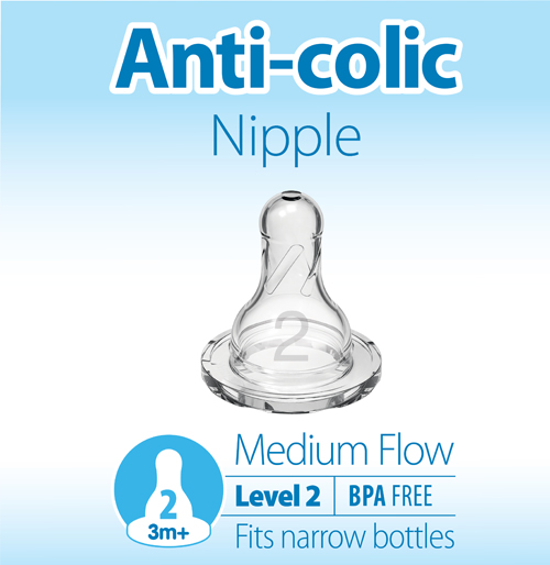 - ANTI-COLIC BABY BOTTLE WITH NIPPLE. Level 2 Nipple, with Anti-Colic internal vent system, is clinically proven to reduce colic. Decreases spit-up, burping and gas and provides a more comfortable feeding experience for baby.