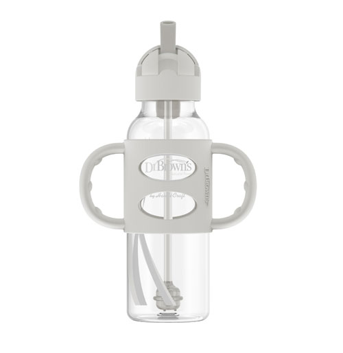 When baby is ready to learn straw sipping skills, take baby steps with the Dr. Brown’s™Milestones™ Sippy Straw Bottle. Baby can continue to use the bottle they love while learning new sipping skills. The soft silicone straw is weighted so baby can tiltand sip while learning upright straw skills. Soft yet sturdy silicone handles make gripping easy and help teach baby new motor skills. A sliding cap keeps messes contained when closed and offers spill-proof travel. Both the sippy straw cap and silicone handles fit all Dr. Brown’s™Options+™8oz/250mL baby bottles and sippy spout bottles, meaning you can teach baby many new sipping skills with the same bottle! Dishwasher (top rack) and sterilizer safe. BPA free. 6m+.