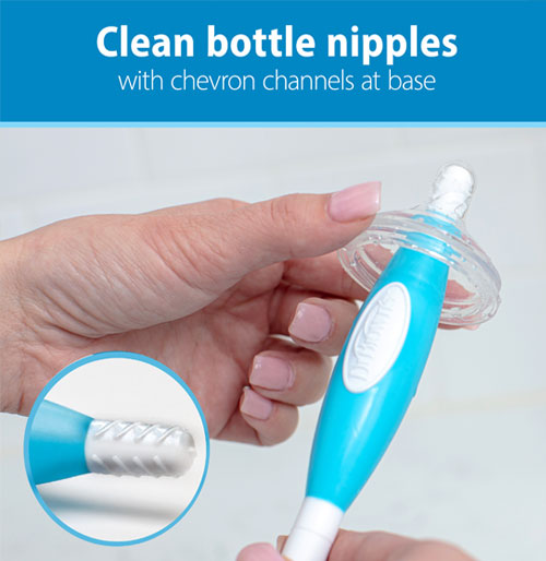 For use with all standard and wide-neck Dr. Brown's Natural Flow baby bottles, this Dr. Brown's Natural Flow Bottle Brush features a grooved, no-slip handle and a combination sponge and bristle brush head for thorough, easy cleaning of bottles. At the base of the bottle brush are fixed chevron channels, designed specifically to clean nipples with ease. A storage clip is included so you can house the brush near the sink.