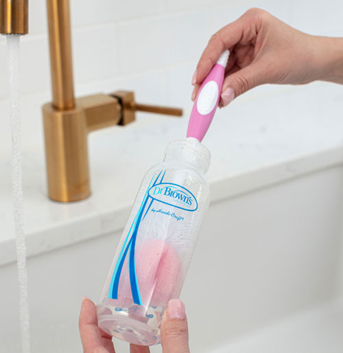 For use with all standard and wide-neck Dr. Brown's Natural Flow baby bottles, this Dr. Brown's Natural Flow Bottle Brush features a grooved, no-slip handle and a combination sponge and bristle brush head for thorough, easy cleaning of bottles. At the base of the bottle brush are fixed chevron channels, designed specifically to clean nipples with ease. A storage clip is included so you can house the brush near the sink.