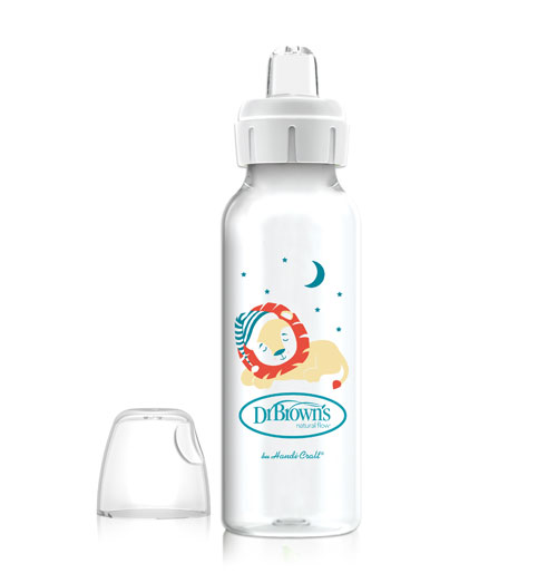 Easy to grip! Easy to Sip! Dr. Brown's™ Milestones™ Sippy Bottle with Handles is the perfect first step from bottle to cup. Introducing a sippy spout has never been simpler – the soft silicone sippy spout is used in place of a nipple on the Dr. Brown’s bottle that baby is already familiar with. Easy-grip 100% silicone handles are removable and fit most narrow bottles, while the snap-on cap keeps the spout clean when on the go. Sippy spout fits any Dr. Brown's Options+™ Narrow bottle after vent is removed. All parts are sterilizer and dishwasher safe (top rack). 8 oz/250 ml, 6m+. BPA free.